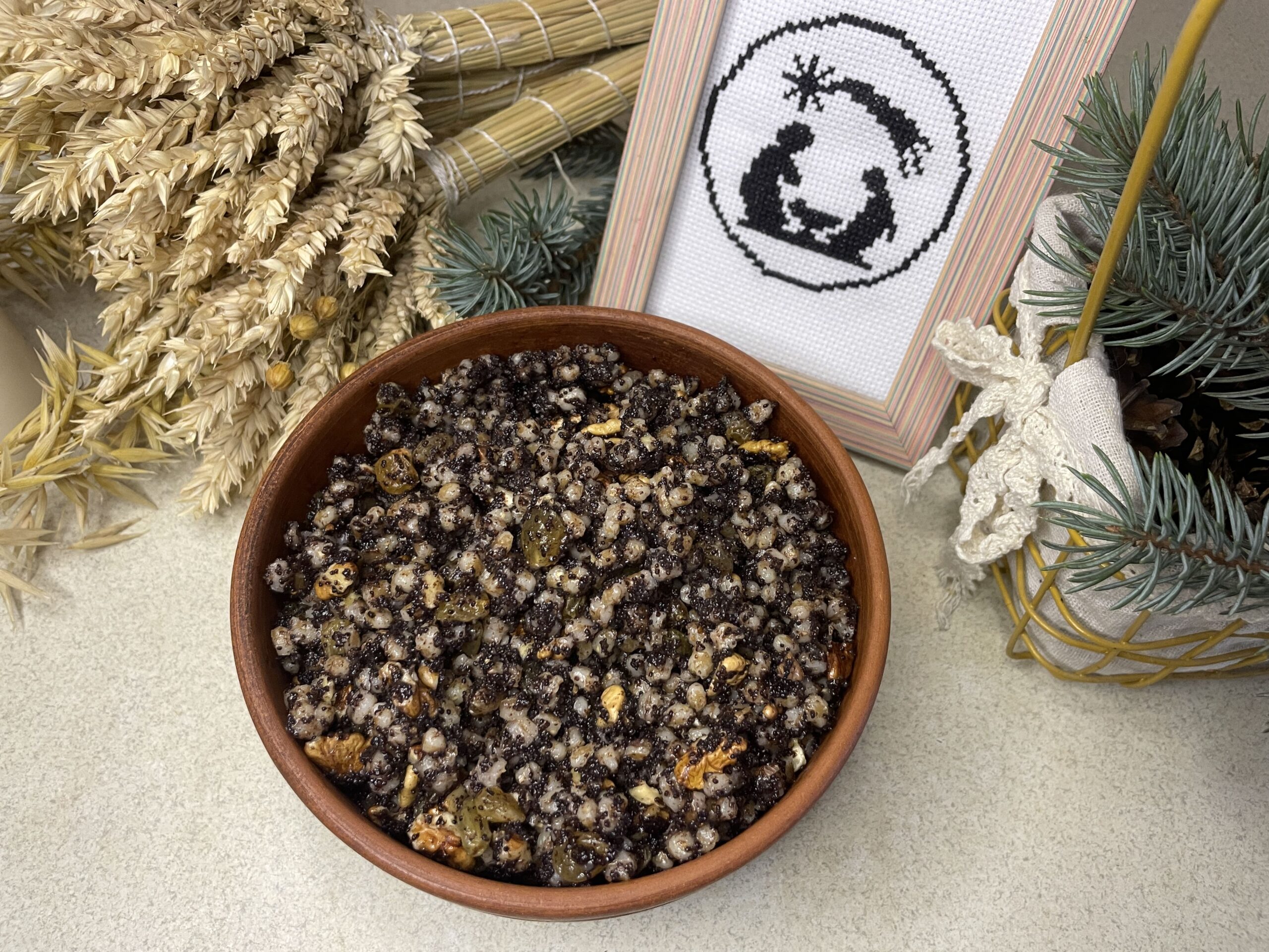8). В глибоку миску висипаємо відварену кутю, додаємо перетертий мак, мед, запарений ізюм та подрібненні горіхи.