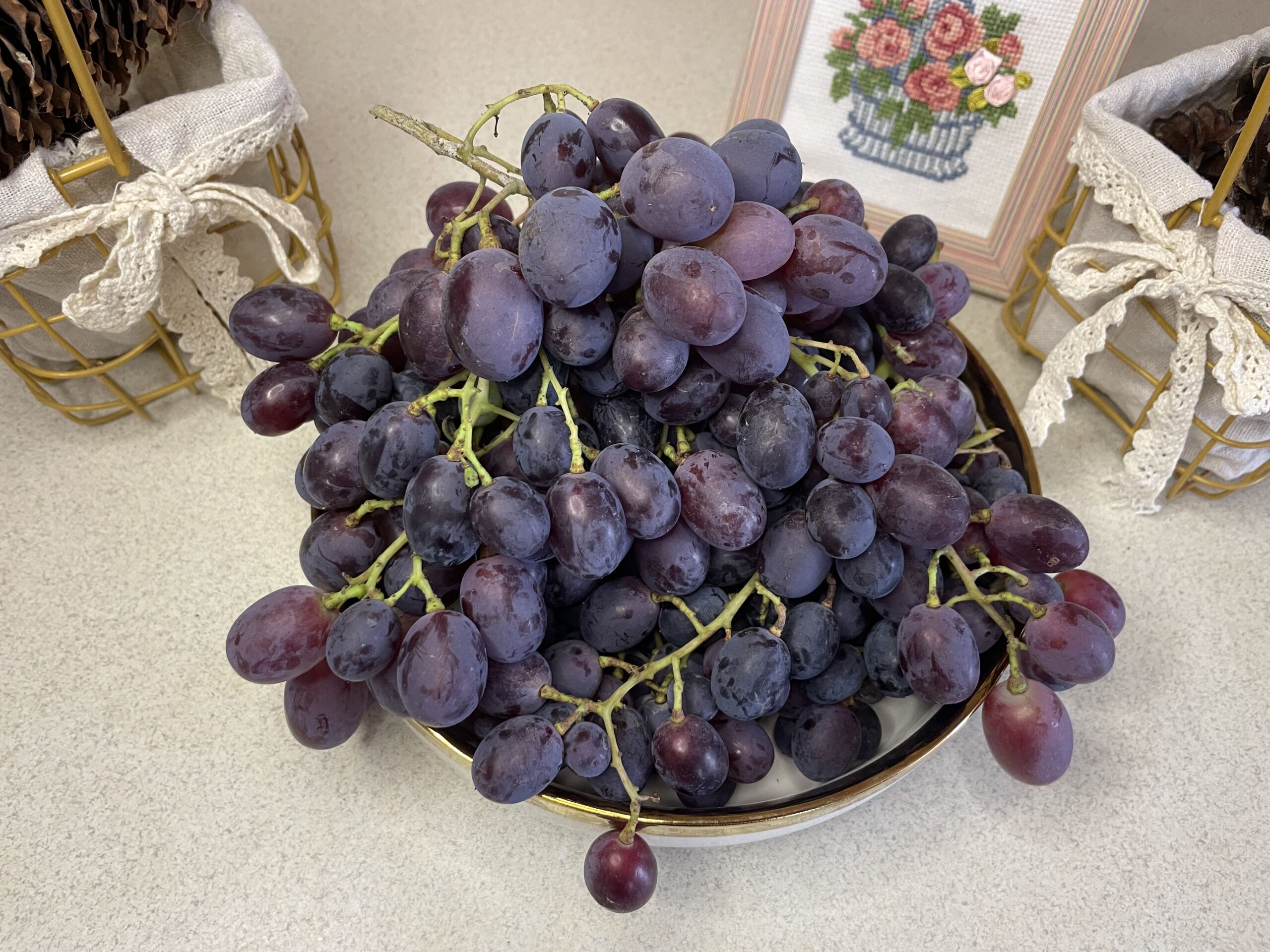 Потім викладають виноград і посипають цукровою пудрою зверху. Ягоди потрібно ґрунтовно обваляти у цьому солодкому інгредієнті.